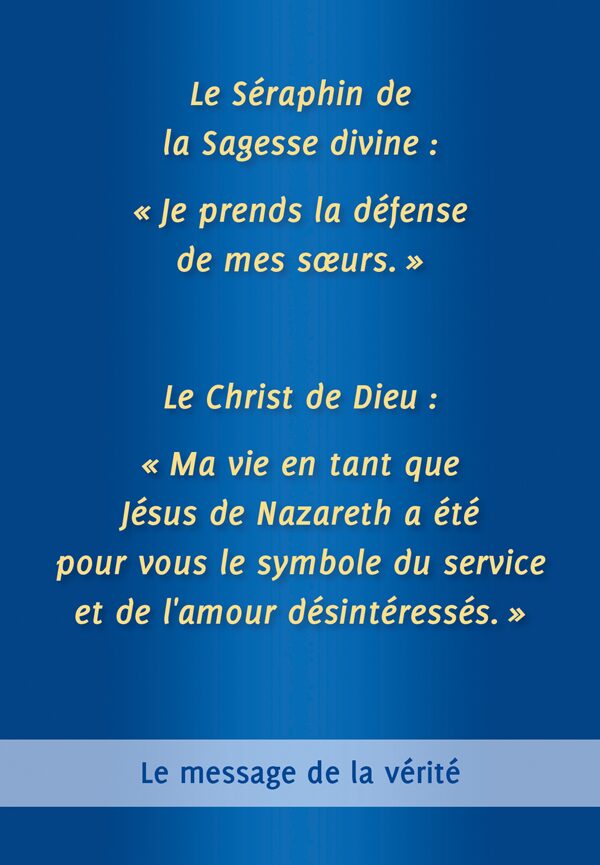 Cette brochure, contenant deux révélations données par le monde divin, est un vibrant appel lancé aux femmes pour qu’elles se libèrent de l’emprise du « monde des hommes » et prennent conscience de leurs véritables valeurs spirituelles. C’est aussi un appel pour l’égalité et l’unité entre les femmes et les hommes.